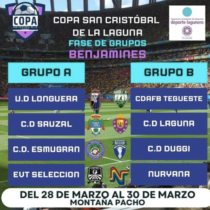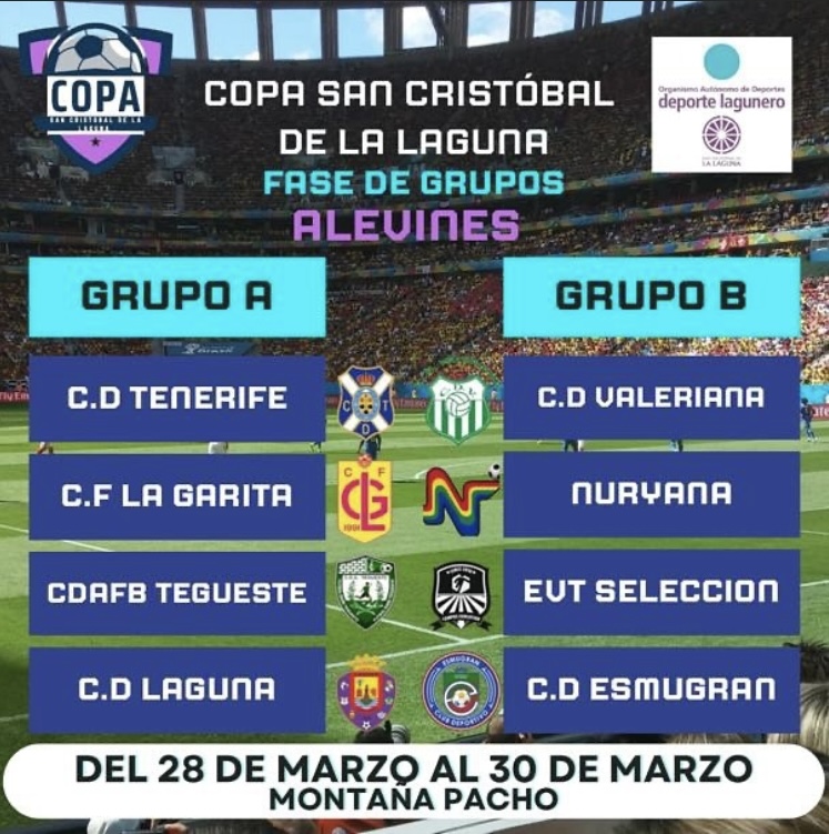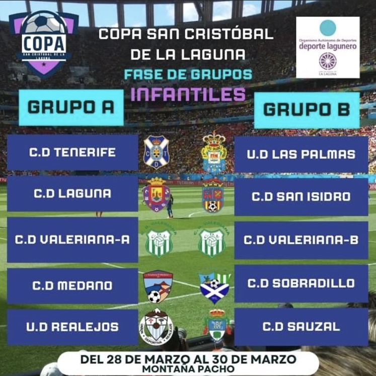 A partir de este jueves 28 hasta el 31 de Marzo se pondrá en marcha la primera edición de la Copa San Cristóbal de La Laguna. El nacimiento de este torneo de fútbol base tendrá lugar en las instalaciones de Montaña Pacho, en una colaboración conjunta entre Campus Evolution y el Organismo Autónomo de Deportes de La Laguna. Destinada a las categorías de Alevín, Benjamín e Infantil, la competición promete ser un verdadero festín futbolístico con la participación de equipos de renombre como la Unión Deportiva Las Palmas o el Club Deportivo Tenerife.